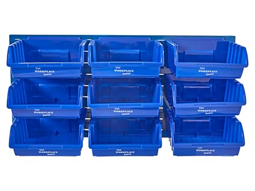 The Workplace Depot Wall Mounted Louvre Panel Kit – Steel Storage Panel 460(H) × 995(W) with Polypropylene Bins – Ideal for Workshop, Garage & Warehouse Organisation (Blue, with x9 Large Bins)