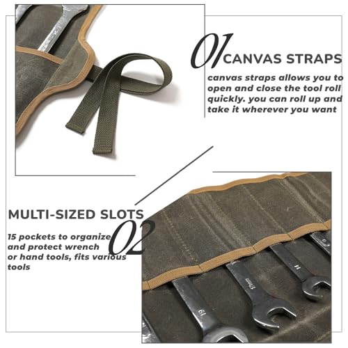 Tool Roll, Heavy Duty 16oz Waxed Canvas Wrench Roll Up Pouch, Multi-Purpose Tool Organize Bag with Straps (26.5" X 12.5", ArmyGreen)