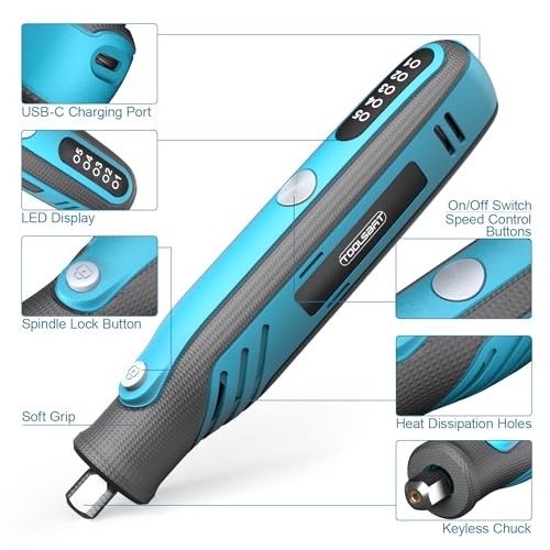 - 【Upgraded Cordless Rotary Tool】TOOLSBAT Cordless rotary tool operates at between 5000/8000/11000/14000/18000rpm to power through any DIY tasks. The variable 5-speed, displayed on an LED screen, provides the flexibility needed for sanding, engraving, drilling, cutting, polishing, grinding, Etching, and carving. Ideal for DIY or home-crafting projects like jewelry making, wood carving, engraving metal, carving drywall, polishing silver, glass cutting, electrical repair, Grinding Dog Nails, etc.