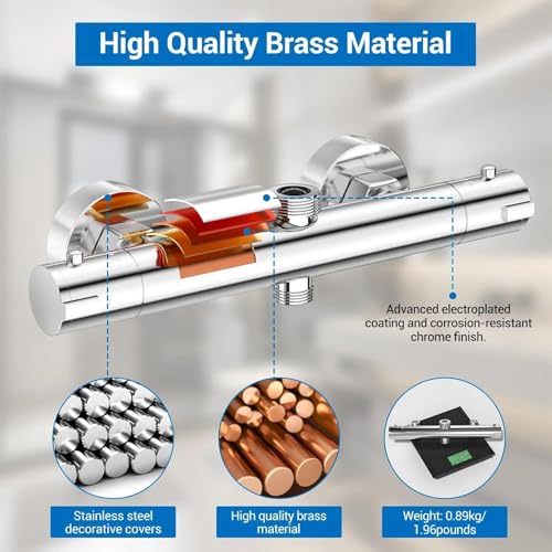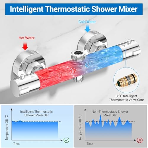 - ✅【THERMOSTATIC SHOWER MIXER BAR 】 Our thermostatic shower mixer bar with dual outlets is designed with advanced thermostat technology. It automatically balances hot and cold water, keeping the temperature stable without sudden changes. No need for constant manual adjustments. (Shower rod, hose, and shower head not included)