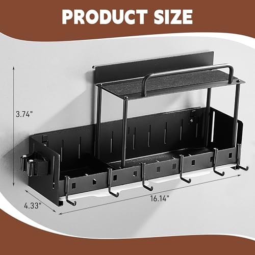 UASIO Wall-Mounted Cleaning Tool Organizer, 16.14×4.33×3.74 inches, Black Storage Rack with Drip Tray, Mop Holder with 5 Hooks