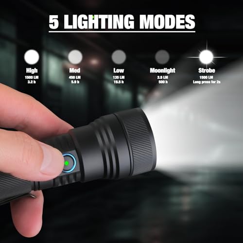 - 5 Lighting Modes: High, Medium, Low, Moonlight and Strobe. It has a mode memory function, so when you turn the torch on again, it will revert to the last mode used. You only need to press and hold for 2S to turn off, no need to cycle through all the modes.