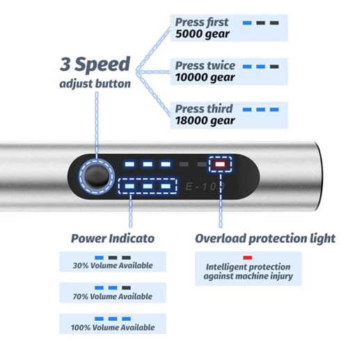• [Adjustable Speed] The rotary tool has 3 adjustable speed (5000, 10000, 18000RPM) The lowest speed let you polishing your nail in safe, the highest speed are also working on metal carving.