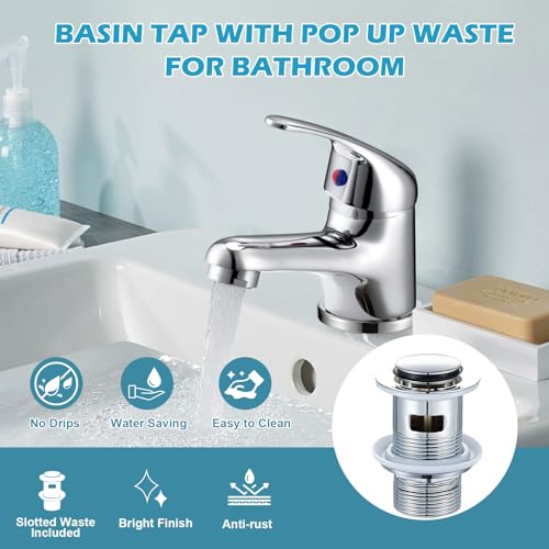 WasserRhythm Bathroom Sink Taps with Pop up Waste Mono Basin Taps Single Lever Chrome Hot and Cold Mixer Tap