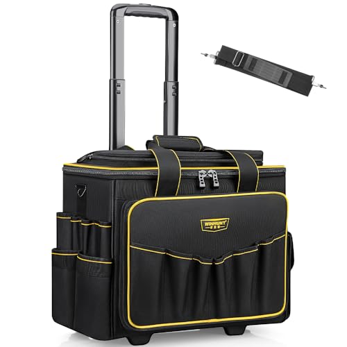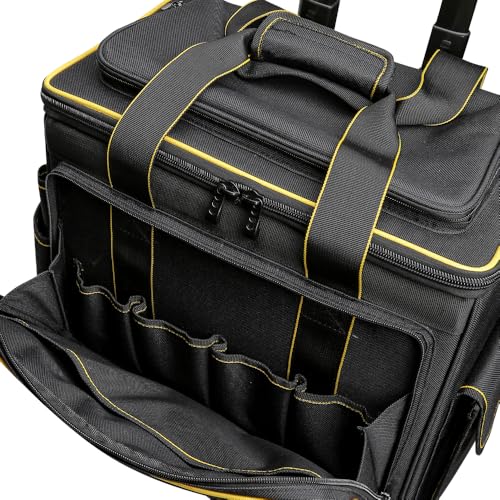 WINNHUNT 46cm Wide Mouth Rolling Tool Bag, 32 Pocket Tool Trolley Bag with Telescopic Handle and 2 Wheels, Black