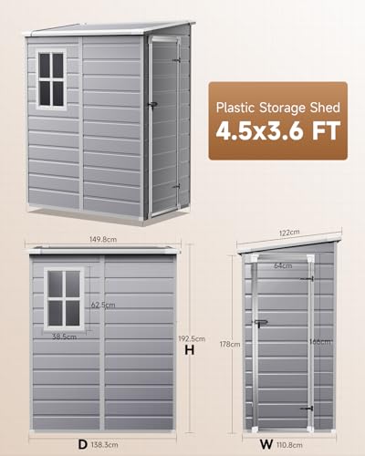 - 【Widely Use】 Our plastic garden storage shed has ample internal usage space, 4.5×3.6 ft indoor space can store garden tools, garden equipment and other large facilities, it can be used in your garden, backyard and patio.