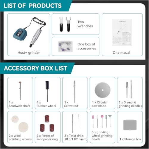 - Complete Accessory Kit – Comprehensive rotary tool kit includes diamond grinding pins, polishing wheels, sanding bands, drill bits(0.5/1.0/1.5mm), cutting discs and more. All accessories neatly organized in a storage box for easy access and portability.
