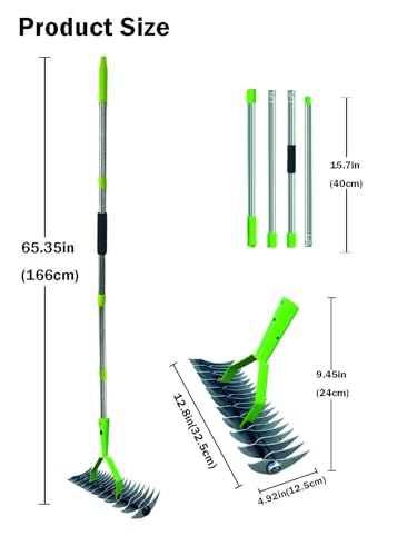 • EAY TO AEMBLE: The lawn rake is designed to be easy to assemble and disassemble, you can adjust the length by installing different numbers of bars as needed, simply turn and tighten the desired number of handle bars, the handle consists of four sections of bars giving you the flexibility of choosing the working length that is comfortable for you, and the head of the rake is secured tightly by double locking screws ensuring that the parts won't fall off.